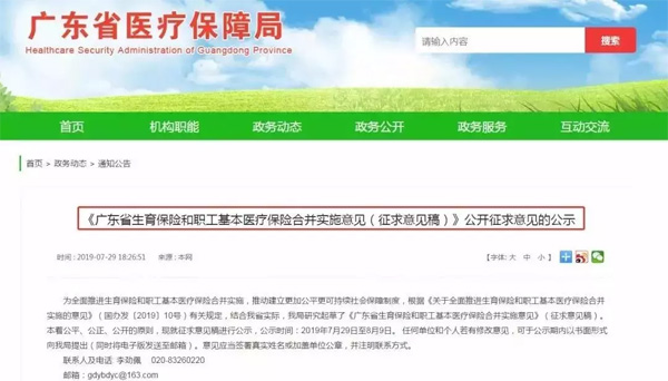 ![]() 就在國家政策發布不久,各地區紛紛響應,出臺相應措施。 7月29日,廣東省醫療保障局發布《廣東省生育保險和職工醫療保險合并實施意見(征求意見稿)公開征求意見的公示》,公示指出:2019年年底廣東省將實現,生育保險和基本醫療保險合并實施。