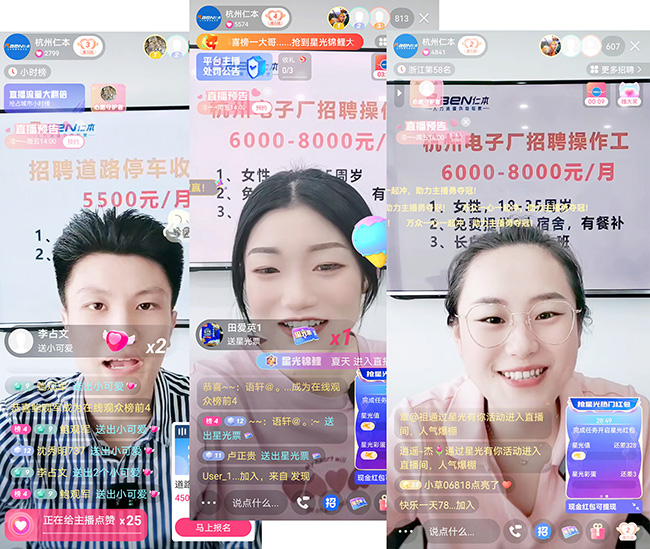 在杭州仁本快手直播間里,我們每天精選高薪優質好工作,給大家詳細推薦! 不管你想去電子廠、食品廠、汽配廠還是醫療廠! 不管你是想要找保安、找普工、找保潔、找外賣員! 不管你是想要日結、長期的、暑期的、項目短期工! 杭州仁本統統幫你安排! 直播間里專業的主播幫助大家詳細推薦工作,有任何問題都可以在直播間里跟主播交流!美女帥哥主播每天陪你聊天找工作!