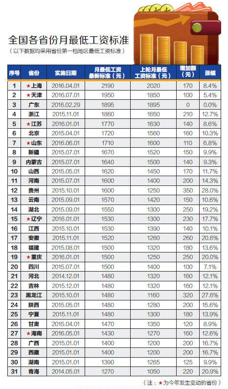從圖表中可以看出,除了2016年已作出調整的7個省份以外,顯示實施日期為2015年的就有22個省份,還有青海和河北目前在實施2014年進行調整的最低工資標準。