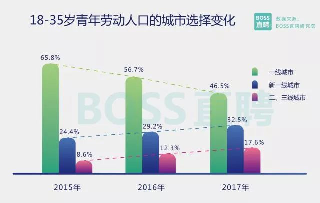 盡管二線城市人才數量快速上升,但在人才質量方面,二線城市還和一線城市有明顯差距。 BOSS直聘數據顯示,2018年旺季,從事互聯網、金融、專業服務等高薪行業且學歷為碩士以上的人才,超過八成仍然選擇在 一線城市打拼。 僅46.5%的18-35歲青年勞動者首選一線城市 BOSS直聘研究院數據顯示,近三年來,工作首選城市為北上廣深的18-35歲青年勞動者比例迅速下降,從 2015年的65.8%下降至2017年末的46.5%。選擇新一線城市的青年勞動者比例直線上升,選擇二三線城市的年輕 人比例也較2015年翻倍。