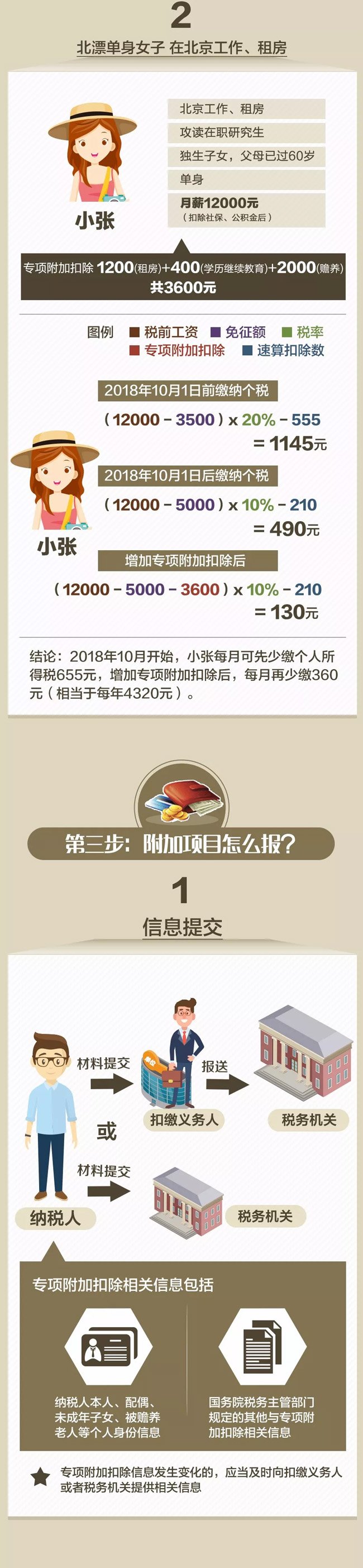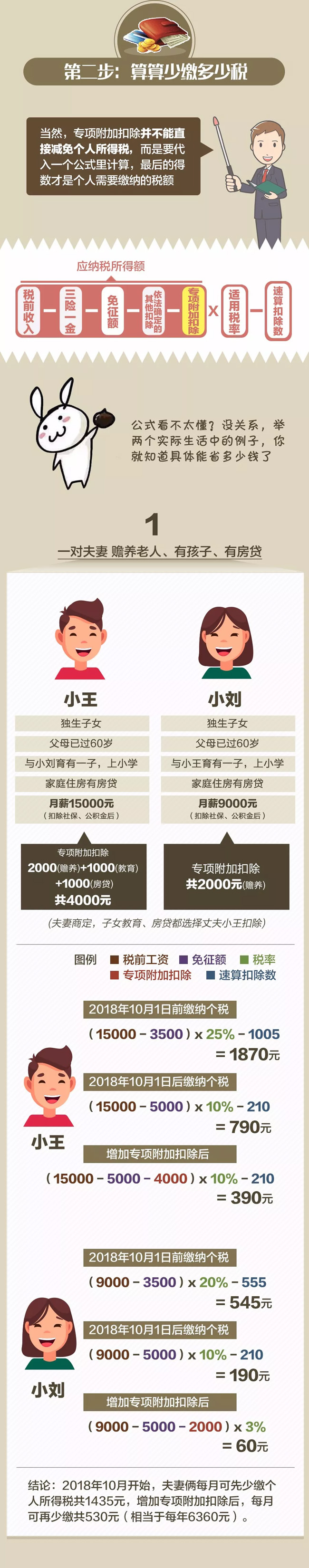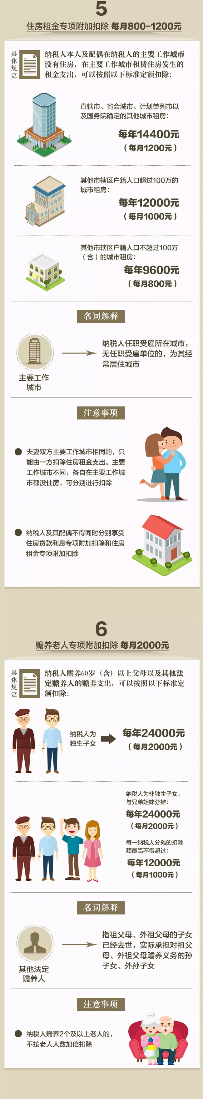 《暫行辦法》明確了個人所得稅法規定的子女教育、繼續教育等6項專項附加扣除的具體實施辦法。享受這些專項附加扣除,需要哪些條件?通過這些扣除項目,納稅人可以少繳多少個稅?跟隨下面這張圖,一起來算算。