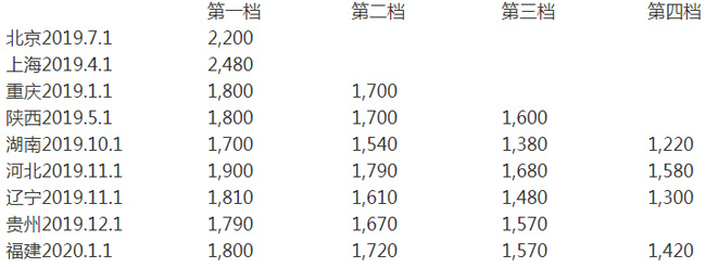 數(shù)據(jù)各省市人社廳官網(wǎng),數(shù)據(jù)截止日期2019年12月。 關(guān)鍵詞10:最低工資標(biāo)準(zhǔn)上調(diào) 熱門指數(shù):☆☆☆ 截至2019年12月,北京、遼寧、上海、湖南等多地已執(zhí)行了上調(diào)后的最低工資標(biāo)準(zhǔn)。調(diào)整后部分省市月最低工資標(biāo)準(zhǔn)情況如下: 部分省市2019年月最低工資標(biāo)準(zhǔn) 地區(qū) 最低工資標(biāo)準(zhǔn)實(shí)行日期 月最低工資標(biāo)準(zhǔn)(單位:元)