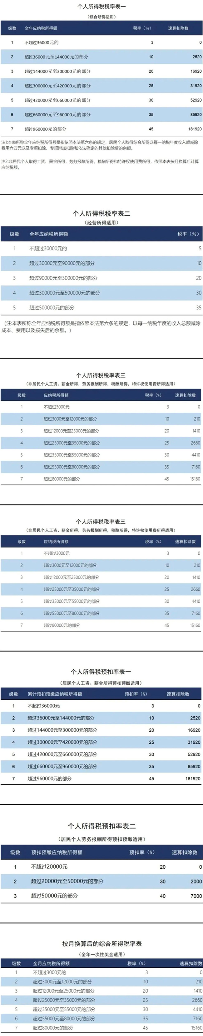 以全年一次性獎金收入除以12個月得到的數額,按照公告《財政部 稅務總局關于個人所得稅法修改后有關優惠政策銜接問題的通知》(財稅〔2018]164號)所附按月換算后的綜合所得稅率表,確定適用稅率和速算扣除數。