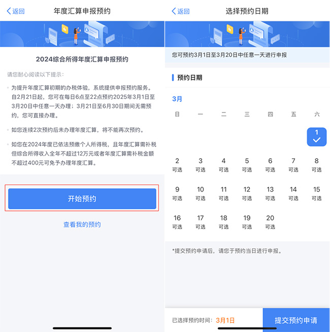 2、選擇預(yù)約日期并提交。 進(jìn)入“年度匯算申報(bào)預(yù)約”界面并閱讀提示內(nèi)容——“開始預(yù)約”——“選擇預(yù)約日期”——“提交預(yù)約申請”。 提交成功后,系統(tǒng)即提示“您已成功預(yù)約”。 預(yù)約成功后,還可在“個(gè)人所得稅”APP首頁中的“2024綜合所得年度匯算”中查看預(yù)約。