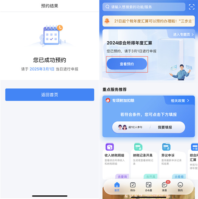注意事項(xiàng) 1、預(yù)約開放時(shí)間為2025年2月21日——3月20日。在3月21日至6月30日期間,無需預(yù)約,可直接在個(gè)稅APP上進(jìn)行匯算清繳。 2、修改預(yù)約日期:“首頁——2024綜合所得年度匯算”——“查看預(yù)約”——“我要取消預(yù)約申請”——預(yù)約新日期。