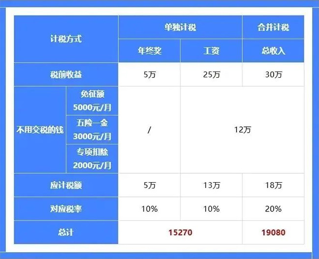 下面來簡單說一下可能導(dǎo)致少退的注意事項: ??子女教育:需要注意各階段銜接時有空檔,比如小學(xué)升初中,6月畢業(yè),9月才開學(xué),這中間有人可能就漏掉了,因為我們可能會習(xí)慣沿用上一年的記錄,所以升學(xué)期記得要改專項扣除資料。 ??繼續(xù)教育:本科及以下在讀,沒有工作的,父母可以用來抵稅; ??大病醫(yī)療:并沒有想象中的門檻那么高,個人自費或自付15000~80000之間的可以扣除。 ??房貸抵扣個稅:可以夫妻分別抵扣或單人抵扣,最好讓工資高的一方單人抵扣; 2、 年終獎“單獨計稅”:巧妙選擇高收益 年終獎發(fā)放月份不同,可能影響清算結(jié)果。比如去年 12 月份發(fā)的,那我們今年 3 月就要記得清算;如果今年 1 月才發(fā),那就明年清算的時候再處理。 年終獎很多朋友再熟悉不過了,而這筆錢并不是發(fā)多少就能實收多少的,因為它也是需要交稅的。 在2027年12月31日前,年終獎可以選擇兩種計稅方式,分別是: 單獨計稅:年終獎和工資分開,分別計算該交多少稅; 合并計稅:年終獎和工資合并,按總收入一共來計稅; 那兩種方式選哪種?我們接著往下看; 以王先生稅前年入25萬,其中,五險一金要扣3000元,每月還有2000元專項額度扣除,加上今年的年終獎5萬,將單獨計稅與合并計稅的差異演示如下: